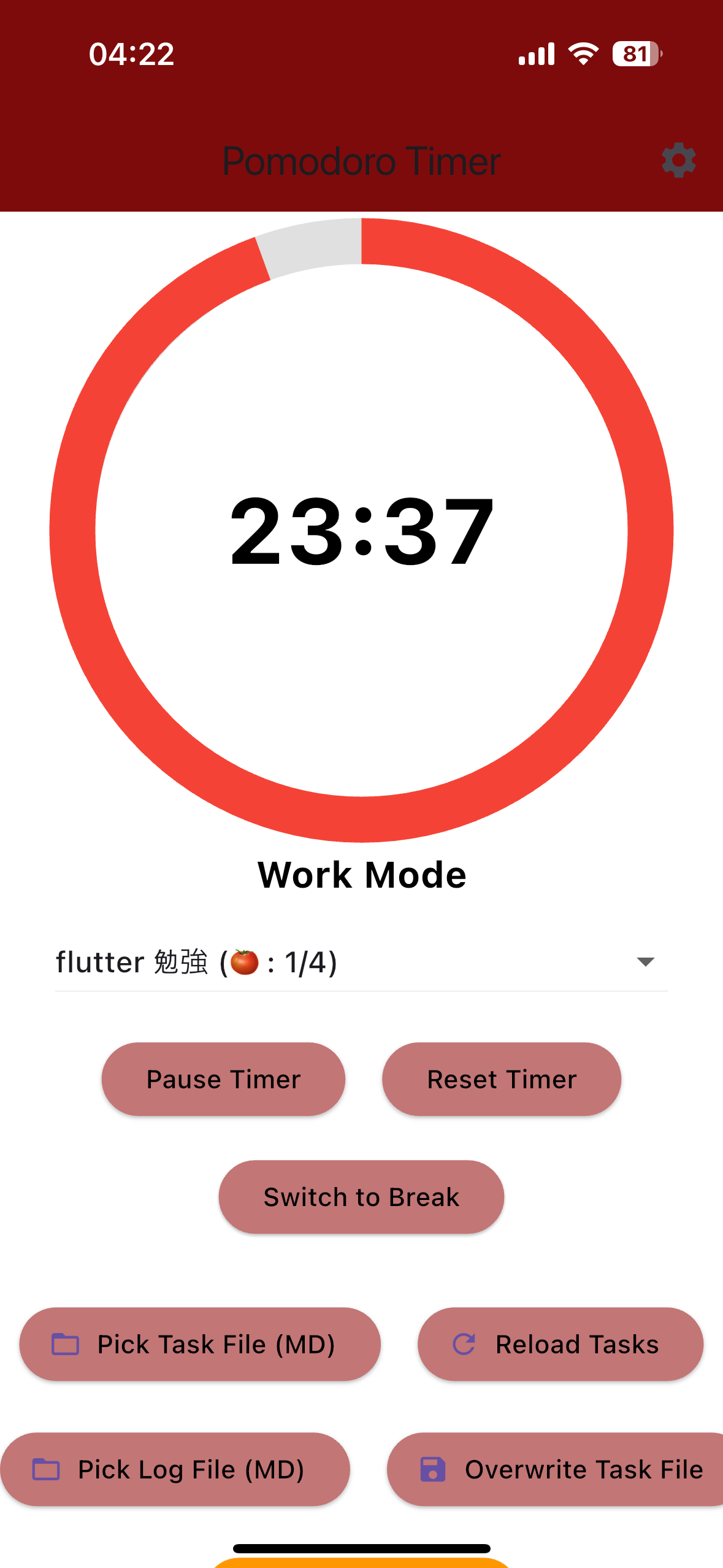 FlutterでiPhoneで使うポモドーロタイマーを製作するプロジェクト。 実は、ポモドーロタイマー自体はすでに山ほど多いです。 私があえて新しく実装した理由は、私が使用するメモアプリObsidianにログを残して連携できるようにするためです。 ObsidianのPCバージョンの場合、コミュニティプラグインにタイマー機能が内蔵されていますが、この機能をObsidianのモバイルバージョンで実行すると、バックグラウンドでタイマーが作動しません。そこで、バッテリーを節約しながら、iPhoneでも自分の作業時間をロギングするためには自分用のアプリが必要でした。